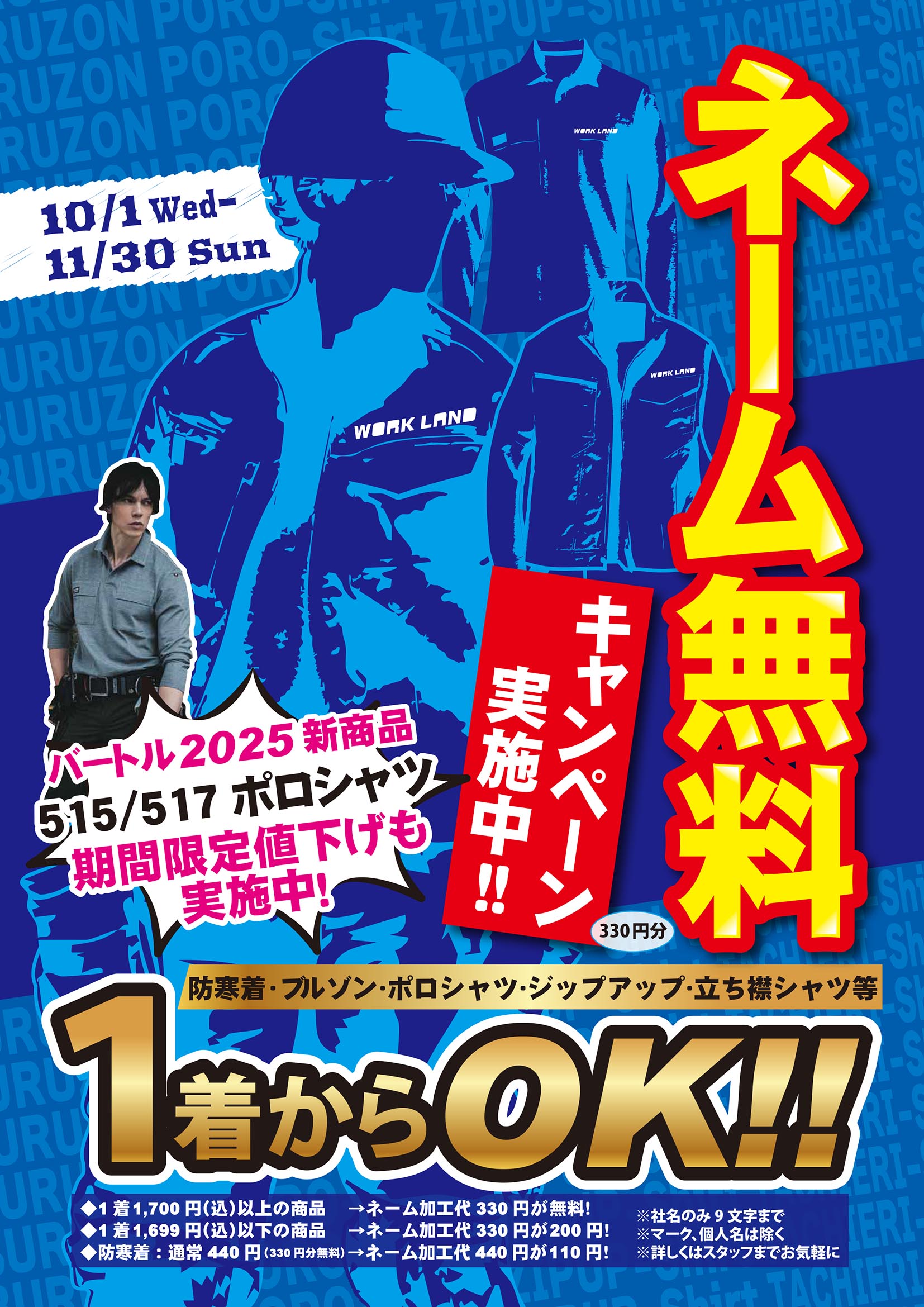 ワークランド各店にてネーム無料キャンペーン実施中!※330円分