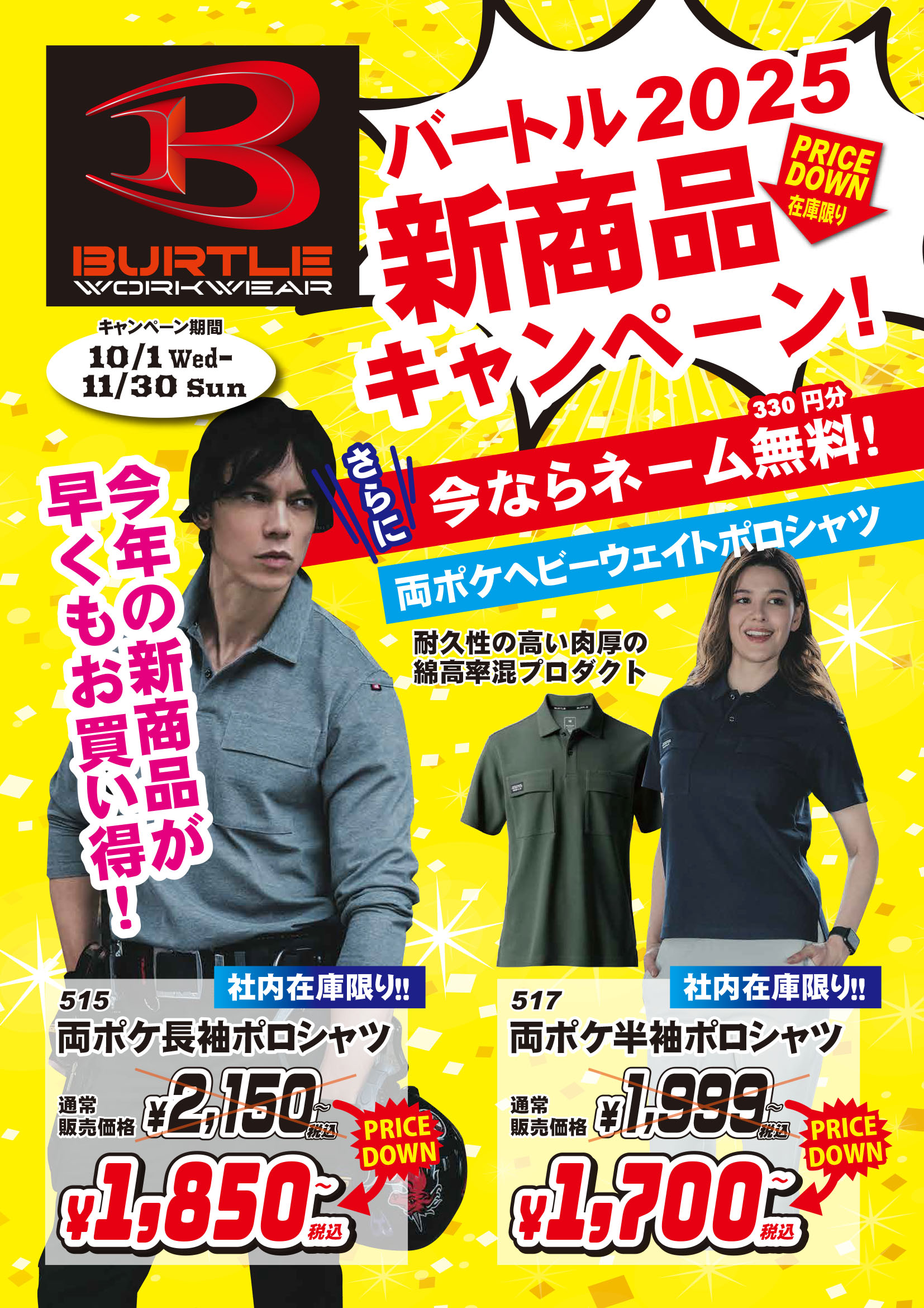 また、バートル2025年最新モデル515/517:両ポケヘビーウェイトポロシャツが
